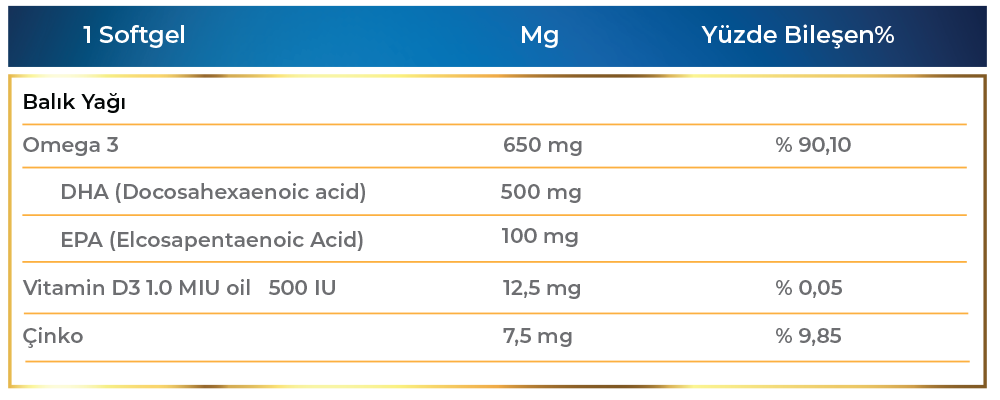 İçindekiler : Balık Yağı (DHA ,EPA,OMEGA -3) , Sığır Jelatini, Deiyonize su, Gliserin (E-422), Çinko glukonat, Kolekalsiferol, Vitamin D3